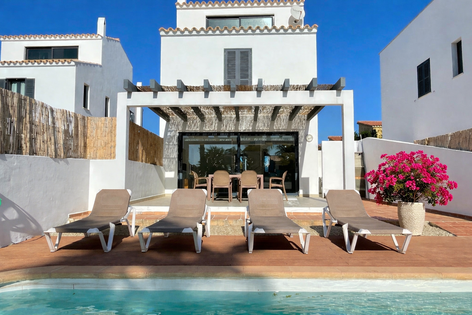 Peace and tranquility are guaranteed at this accommodation—relax with the whole family! Villa Son Blanc, located in one of the quietest residential areas of Ciutadella, just a short distance from the sea, is arranged over three floors and features two double bedrooms, one single bedroom, and one quadruple bedroom with two bunk beds, along with two full bathrooms, one guest toilet, a fully equipped kitchen, and a spacious living–dining room.